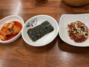 おまけでおつまみで、カクテキ、韓国海苔、チャンジャの写真。